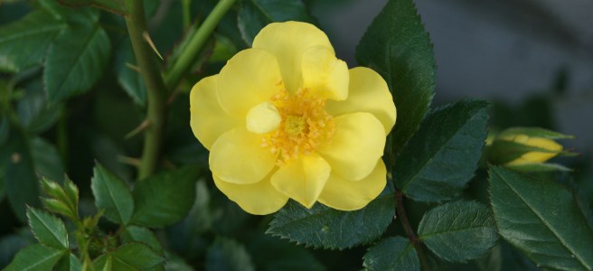 This rose, I learned, will flower continuously until Fall and the flowers will not fade to white. Because I’m such a lover of yellow lately, I thought it would make a nice picture set beside our side door which I intend to paint red or perhaps colonial blue. I have yet to decide.