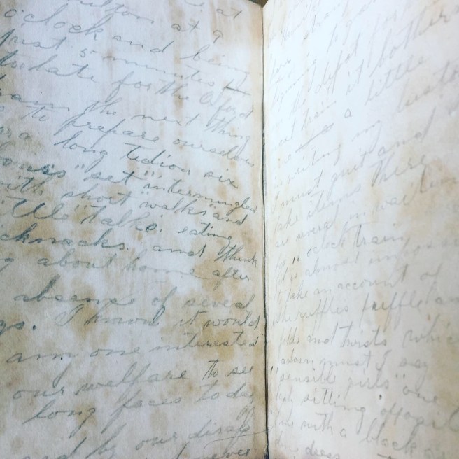 “Arrived here at Hamilton at 9 o’clock and being just 5 minutes too late for the Oxford train the next thing is to prepare ourselves for a long tedious six hours “set” intermingled with short “walks” and little talks. Eating “knickknacks” and thinking about home after an absence of several days. I know it would do anyone interested in our welfare to see our long faces today caused by our disappointment however I believe shall throw dull care away and be a Hamiltonian while here. Strangers are beginning to gather in the depot for the next train. It bothers me a little in writing my [sic] I must grit and take it. There are several in waiting for 12 o’clock train. It is almost impossible to take in account the ruffles, fruffles and folds and twists which adorned most, I say, sensible girls. One lady sitting opposite me with a black [sic] dress on trimmed in puffed about in black silk well as near as I can tell she is a puff anyway held together with a massive gold watch and chain. She is gone now. It is half after 12 o’clock.” .