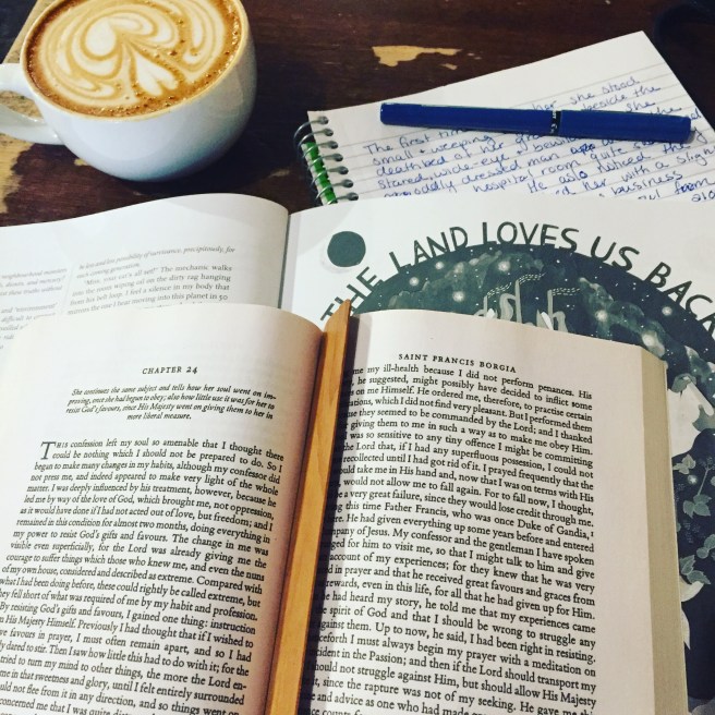 Pictured is one fancy latte, St. Teresa de Avila’s memoir, the Climate Justice issue of @geezmagazine, and my notebook with a new story in the works. 😄