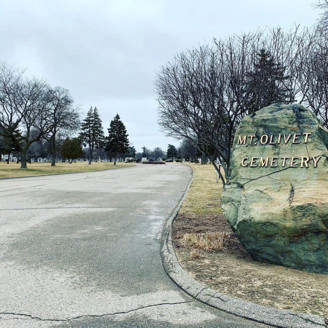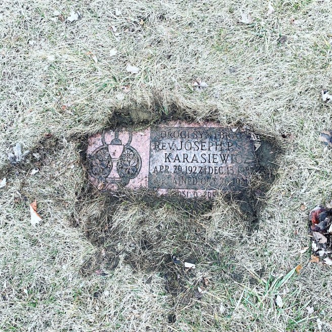 More on my journey back to the neighborhood of Poletown razed for the GM plant in 1981. Found Father Joseph Karasiewicz’s grave today against terrible wind and bone-numbing chill in a deserted graveyard. Father Joe was known as the “iron priest of Poletown”, he fought to save the Immaculate Conception church with his life. He died from a broken heart 6 months after GM bulldozed his church.