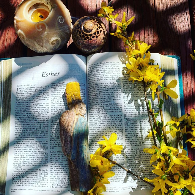 Before Christ, in the Old Testament, under the old covenant, only priests were allowed near the altar, and they acted as the mediators between God and man. The book of Esther is symbolic to this as it describes her standing in the inner court in front of the king’s hall. The king sees Queen Esther just outside his inner court, HE FINDS FAVOR IN HER (a statement we read often in scripture when God’s relationship to his people is discussed) and holds out his scepter to her as a sign that it is ok to approach him. She moves towards him and touches the very tip of his scepter, a sign of her obedience and humility. To me her approach is like those hoping to come to God either for the first time or after a long hiatus. We have to approach with humility and an open heart, yet we do not have to be pure, or holy, or of a certain worldly stature. We are allowed to come as we are. Esther, who despite knowing she was doing something against the man-made laws of the day said she would approach the king to save her people the Jews from being slaughtered, “even though it is against the law. And if I perish, I perish.” In this statement she showed her bravery. This kind of bravery is what God wants to see from us, wants us to cut through all the worldly “laws” like our own expectations, guilt, rules, etc., right to Him. And He will find favor in us for this—we will become his special students in that moment, He will take us under His wing and show us wonderful miracles and bless us tremendously, especially show us how to find His kind of joy in this life if we keep our eyes open to Him. .